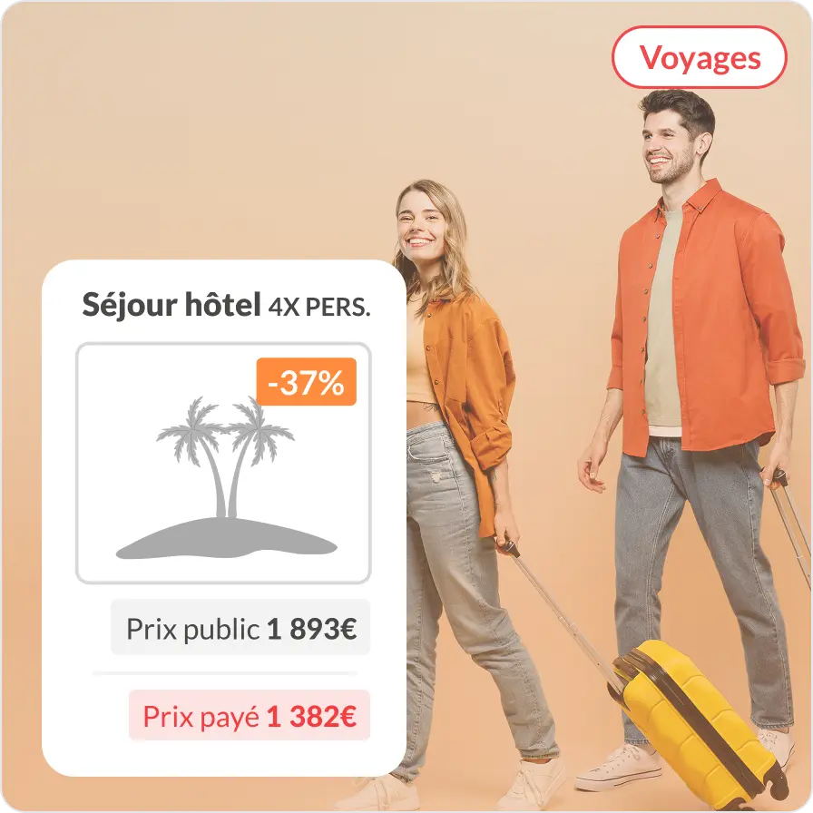 Proposez à vos salariés des subventions pour leurs voyages et séjours en France et partout dans le monde avec des réductions sur les réservations d’hôtels, les billets d’avion, de train, et de bus. Grâce à notre plateforme de voyage intégrée, vos employés peuvent planifier leurs vacances avec nos principaux partenaires