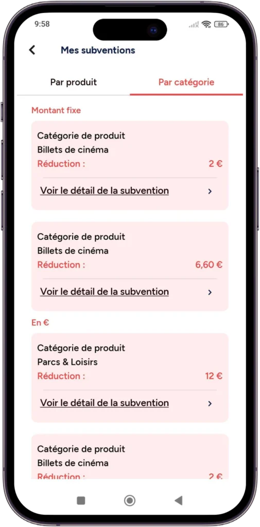Les subventions produits améliorent le bien-être des salariés en leur donnant accès à des réductions sur des produits et services qui répondent à leurs besoins. Ces avantages cumulés, aux réductions de la plateforme de CE externalisé augmentent considérablement leur pouvoir d’achat grâce à des réductions significatives disponibles toute l’année. Faire profiter aux salariés d’un module de subvention engendre de la satisfaction, une meilleure QVT et un engagement plus fort envers l’entreprise.